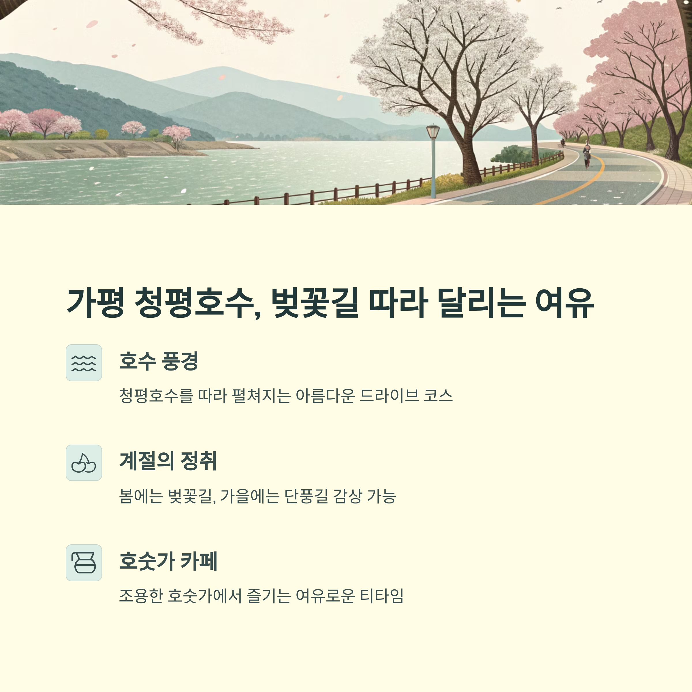| 서울 1시간 거리로 당일 가능 | 계절마다 달라지는 풍경 | 여유와 힐링을 함께 느끼는 장소 |