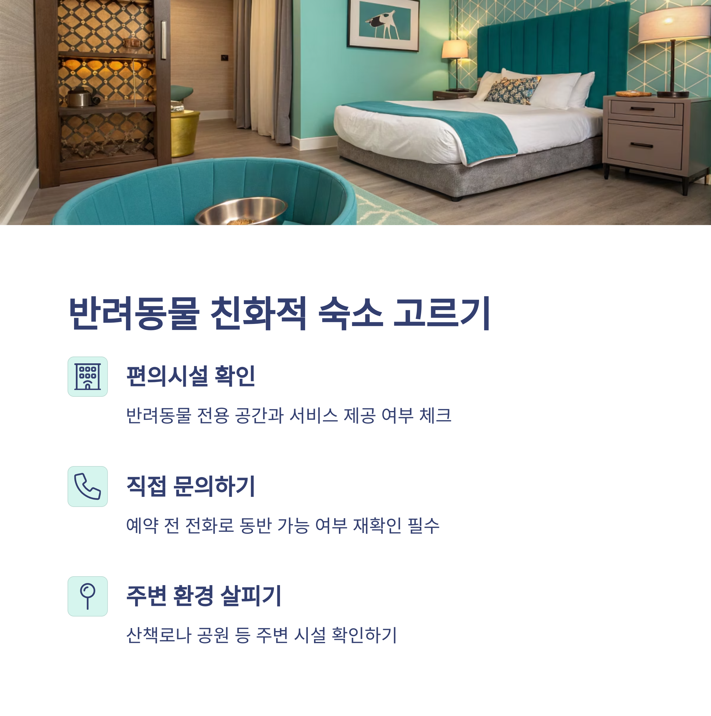| 반려동물 환영 서비스, 편의시설 완비 여부 체크 | 사료, 물, 장난감, 배변패드 등 챙기기 | 이동장, 하네스, 휴식 시간 확보 중요 |