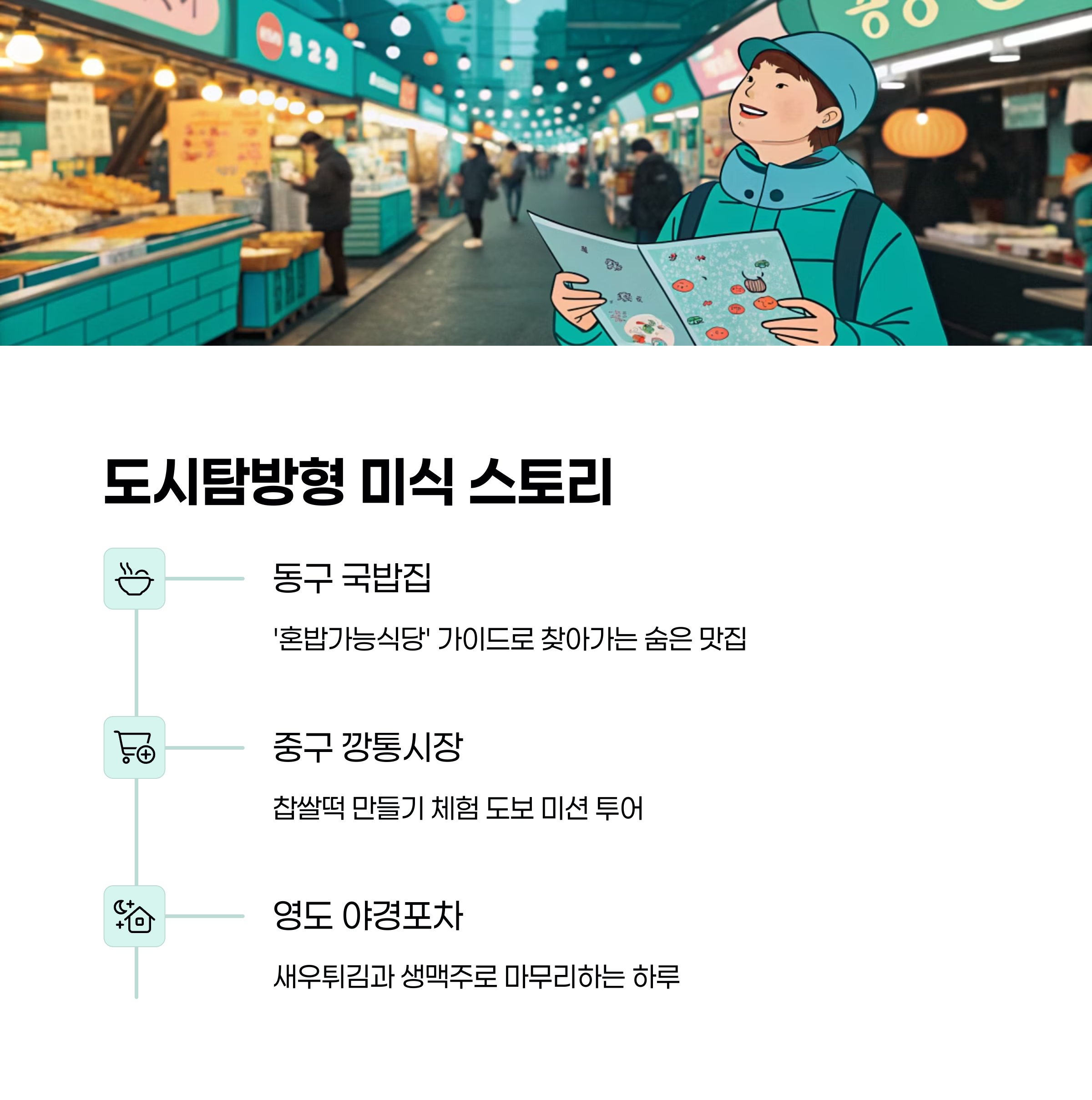 “혼밥족 김지수 씨는 ‘혼밥가능식당’ 가이드북을 들고 동구의 숨은 국밥집을 찾아 나섰다. 이어진 도보 미션 투어에서는 중구 깡통시장에서 찹쌀떡 만들기 체험도 했다. 저녁에는 영도 야경포차에서 새우튀김과 함께 생맥주 한잔으로 하루를 마무리했다.”