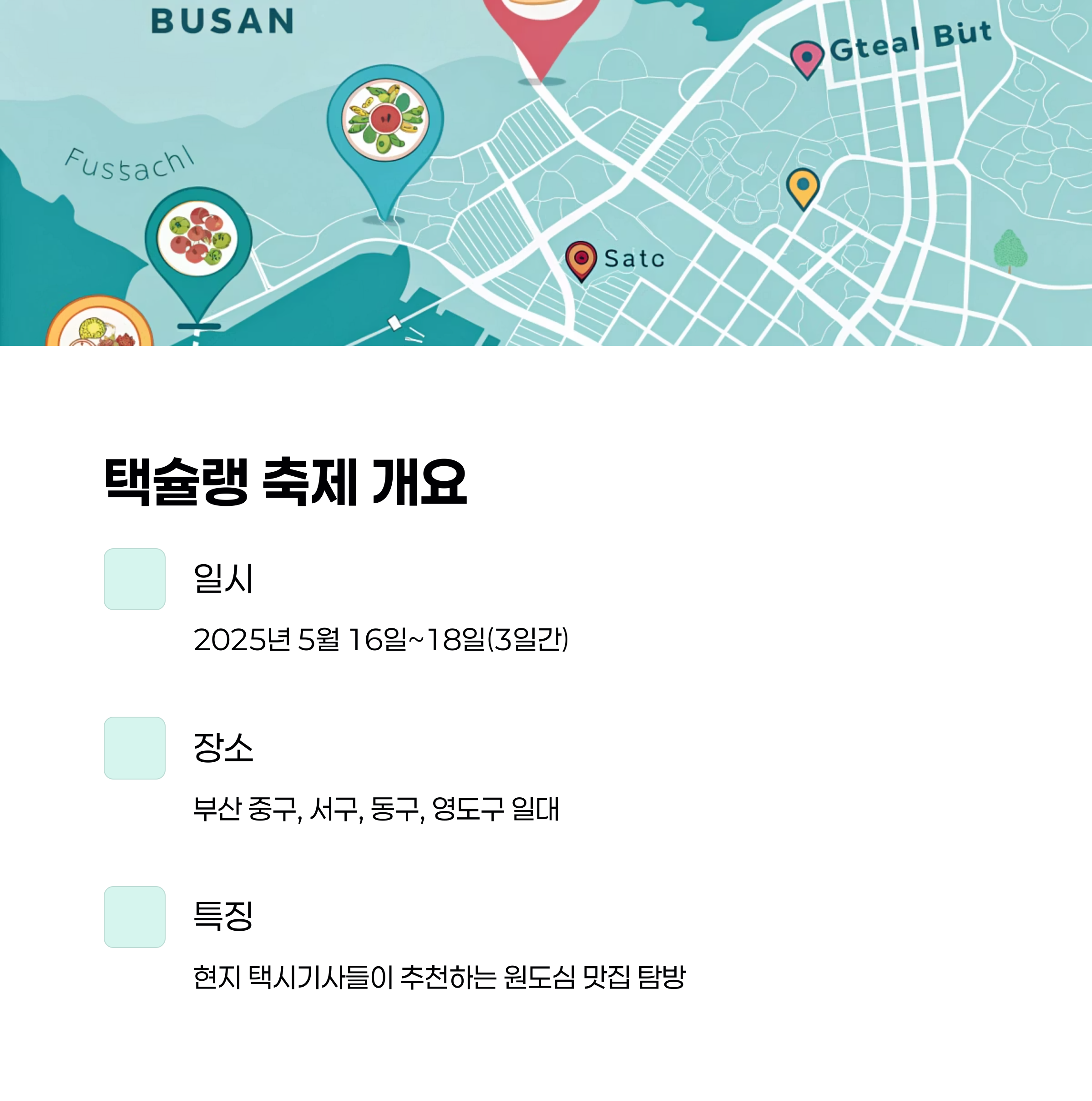 부산의 숨은 미식 명소를 현지 택시기사들의 추천으로 만날 수 있는 이색 축제 ‘택슐랭’이 2025년 5월 16일부터 18일까지 3일간 개최됩니다. 부산의 중구, 서구, 동구, 영도구 일대에서 열리는 이번 축제는 원도심의 정취와 로컬 맛집을 한눈에 즐길 수 있는 기회를 제공합니다.
