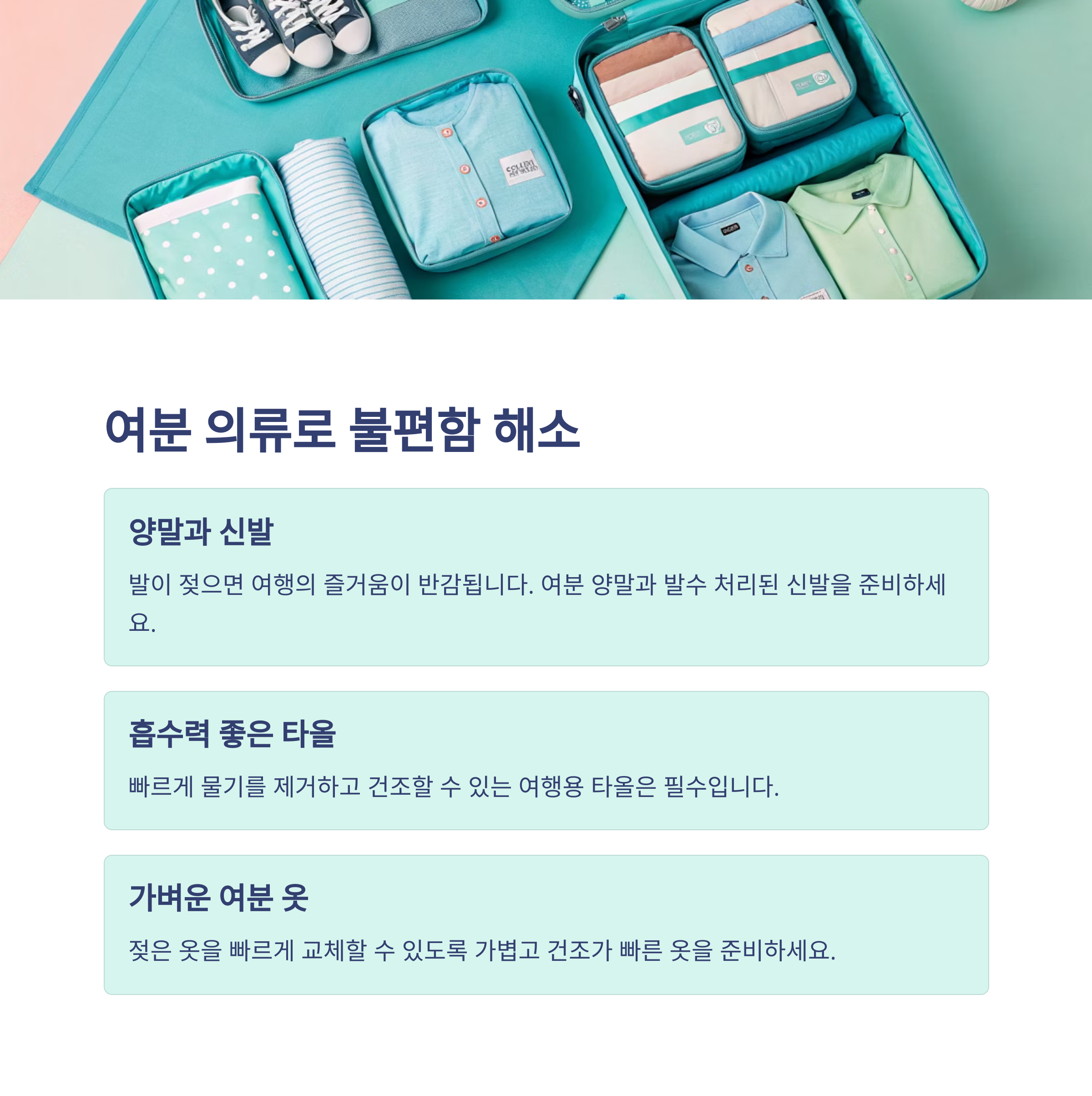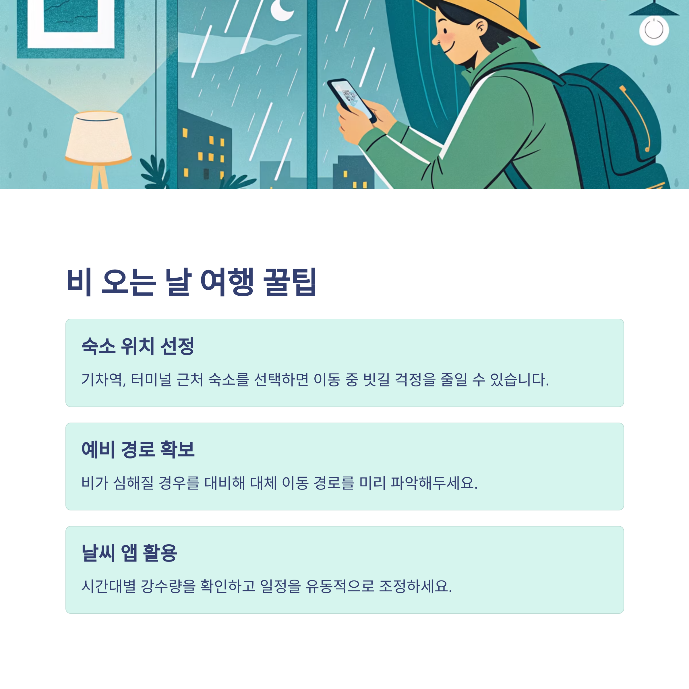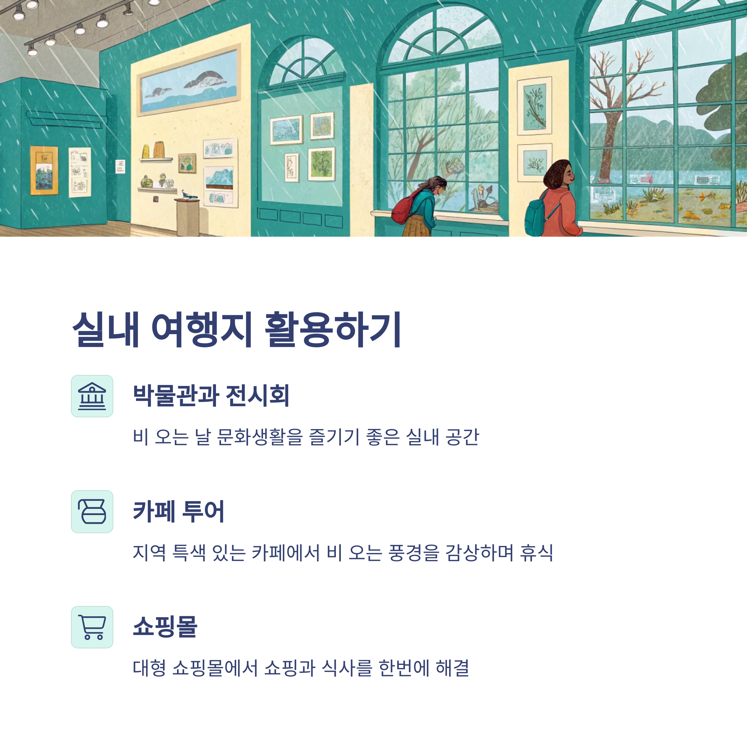 | 방수 아이템 | 여분 의류 | 실내 여행지 |