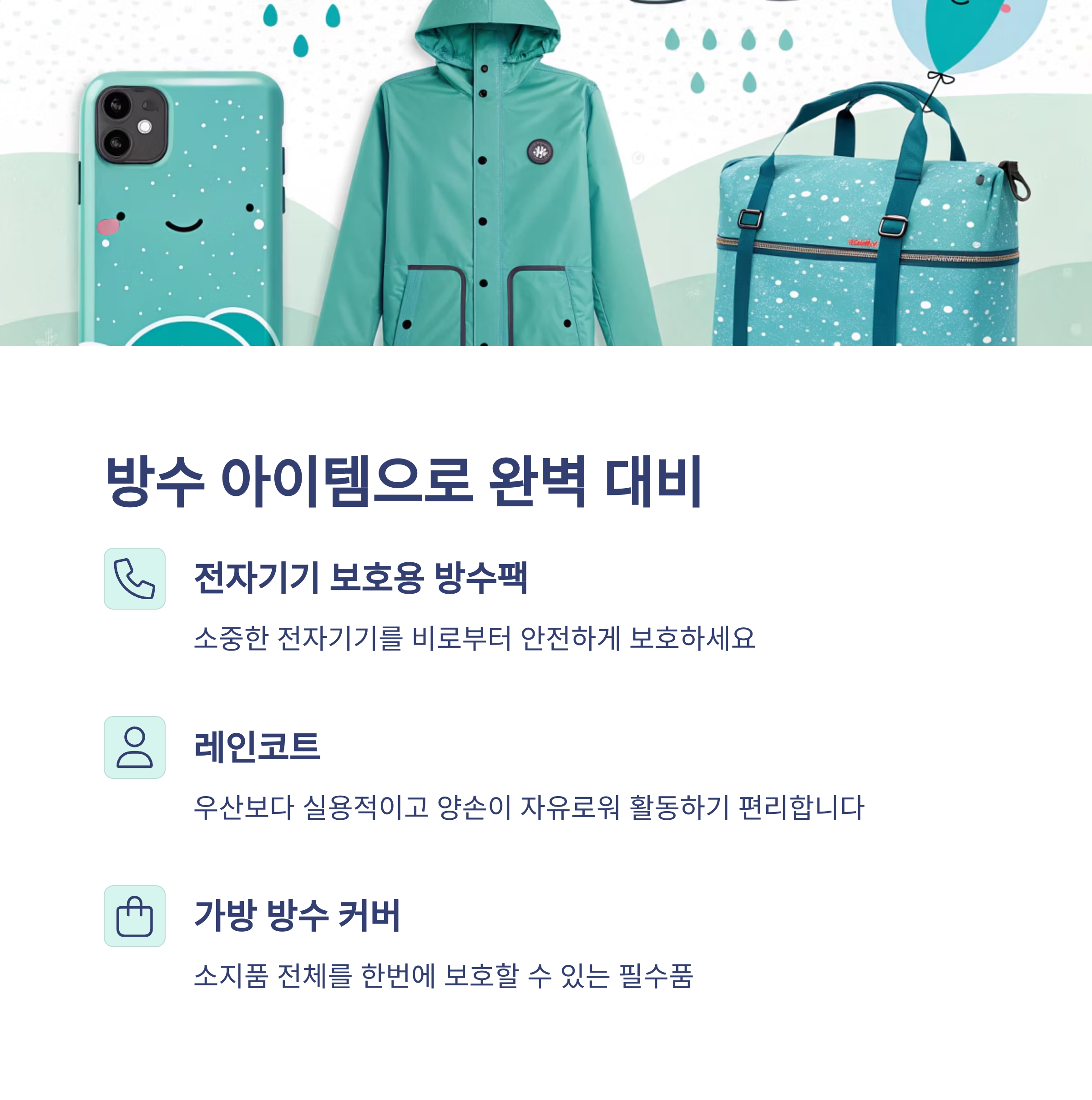 | 방수 아이템 | 전자기기 보호용 방수팩은 필수입니다. |