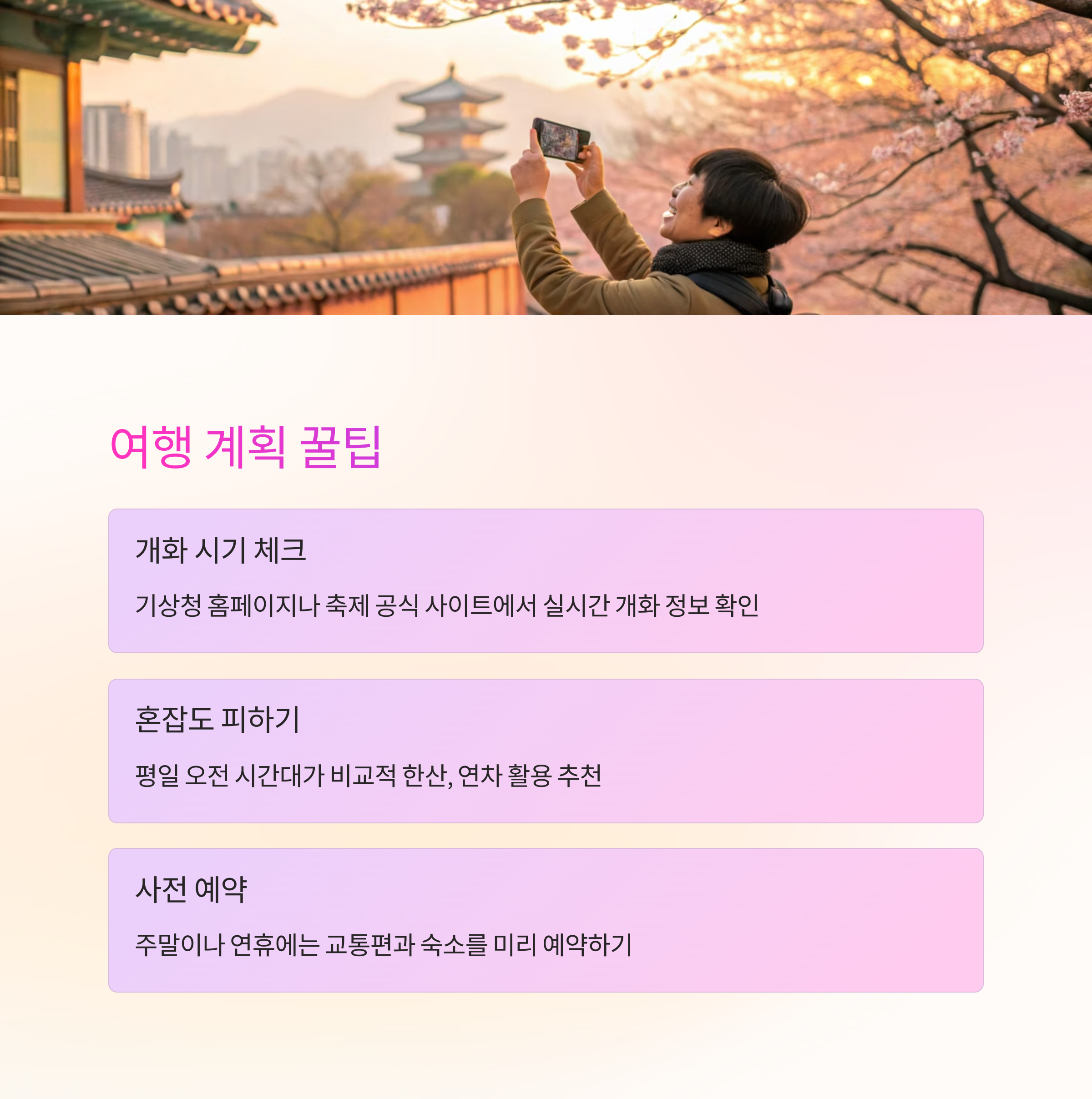 봄 여행을 계획할 때는 날씨 변화와 휴일 일정을 고려하는 것이 중요합니다. 특히 주말이나 연휴에는 많은 인파가 몰리므로, 미리 교통편과 숙소를 예약하는 것이 좋습니다. 또한 벚꽃의 특성상 며칠 사이에 풍경이 달라지기 때문에 실시간 개화 정보와 지역 축제 일정을 체크하는 것도 잊지 마세요. 여행의 질을 높이는 가장 좋은 방법은 사전 준비입니다.