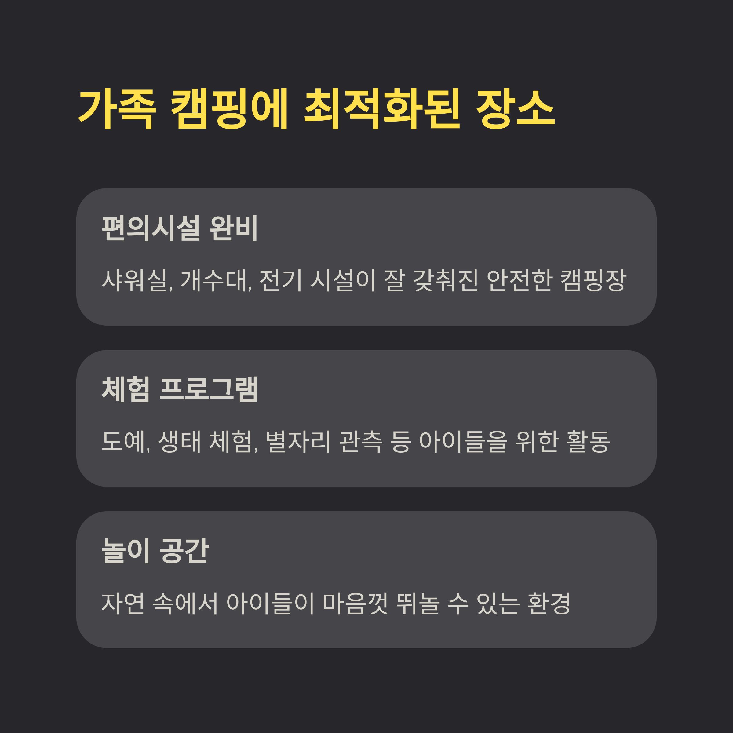 | 가족 캠핑에 적합한 장소 | 어린이와 함께 즐길 수 있는 안전한 캠핑장 안내 |