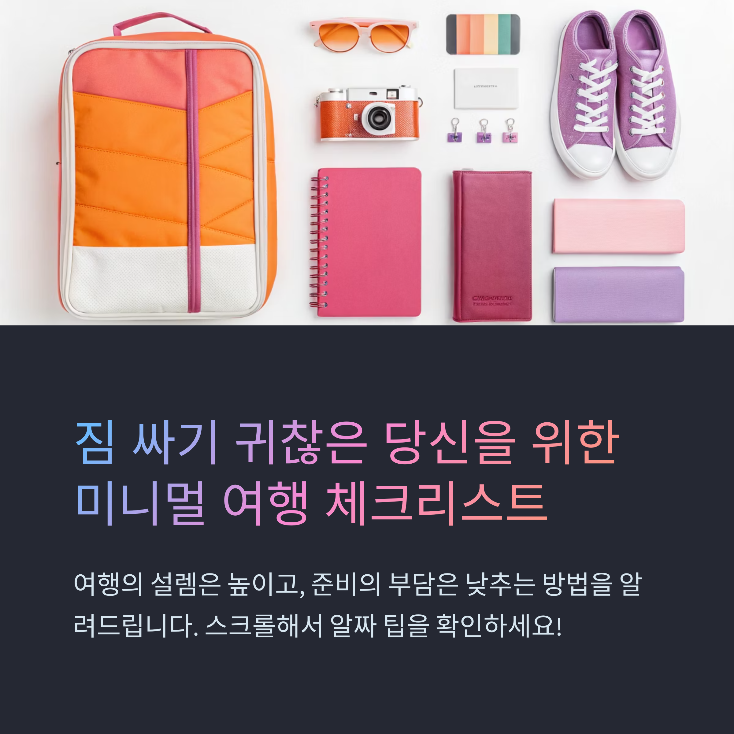 | 세면도구, 속옷, 충전기 등 필수 소지품입니다. | 출발 전 반드시 점검해야 할 핵심 항목들입니다. | 가볍게 떠나고 싶은 분들을 위한 최소 준비 방법입니다. |