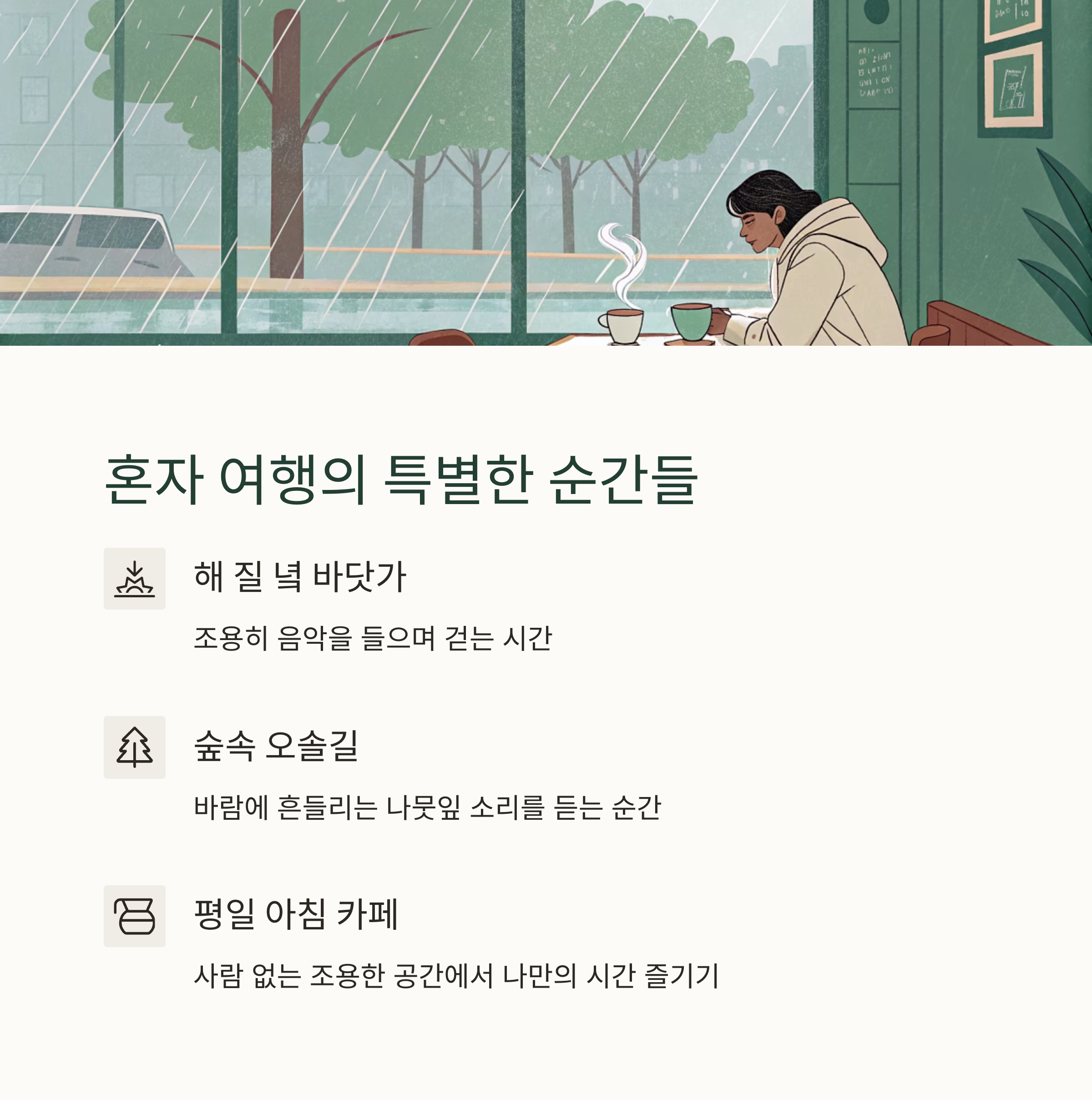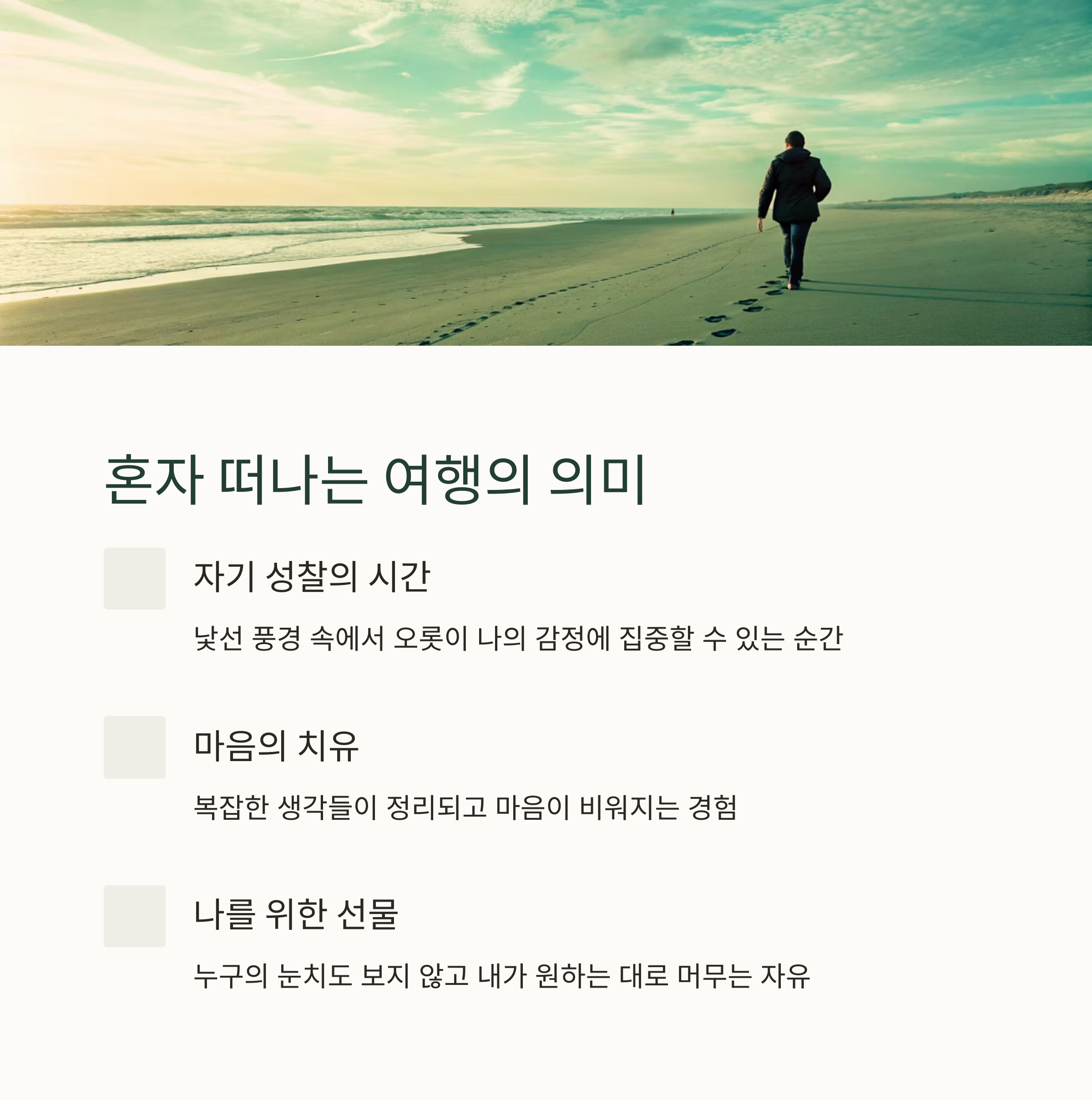| 강릉, 남해, 인제 등 혼자 떠나기 좋은 곳들 | 자연과 함께 마음의 평화를 찾을 수 있는 장소 | 동선 구성, 숙소 선택, 여유 있는 일정이 핵심 |