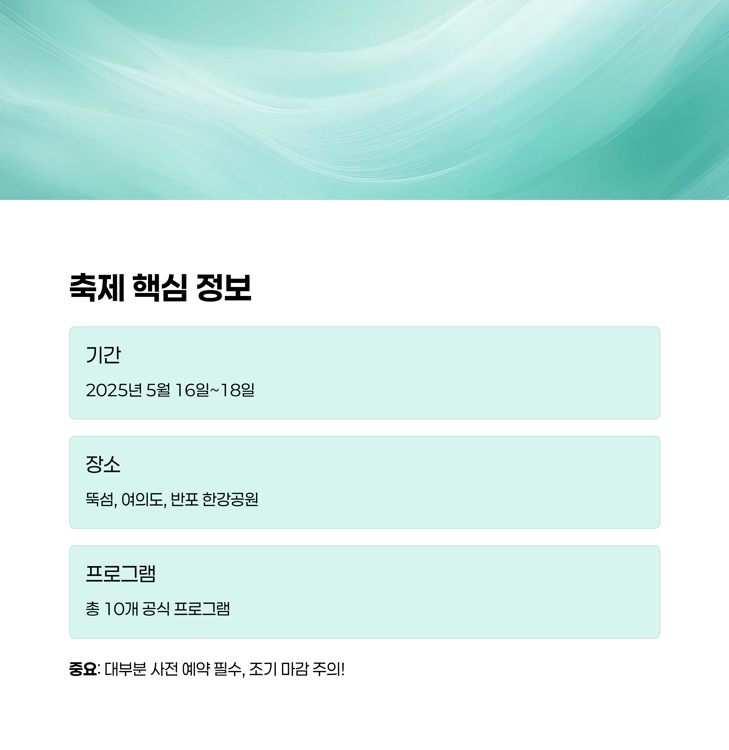 서울의 대표적 사계절 축제인 한강페스티벌이 2025년 5월 16일부터 18일까지 3일간 열린다.