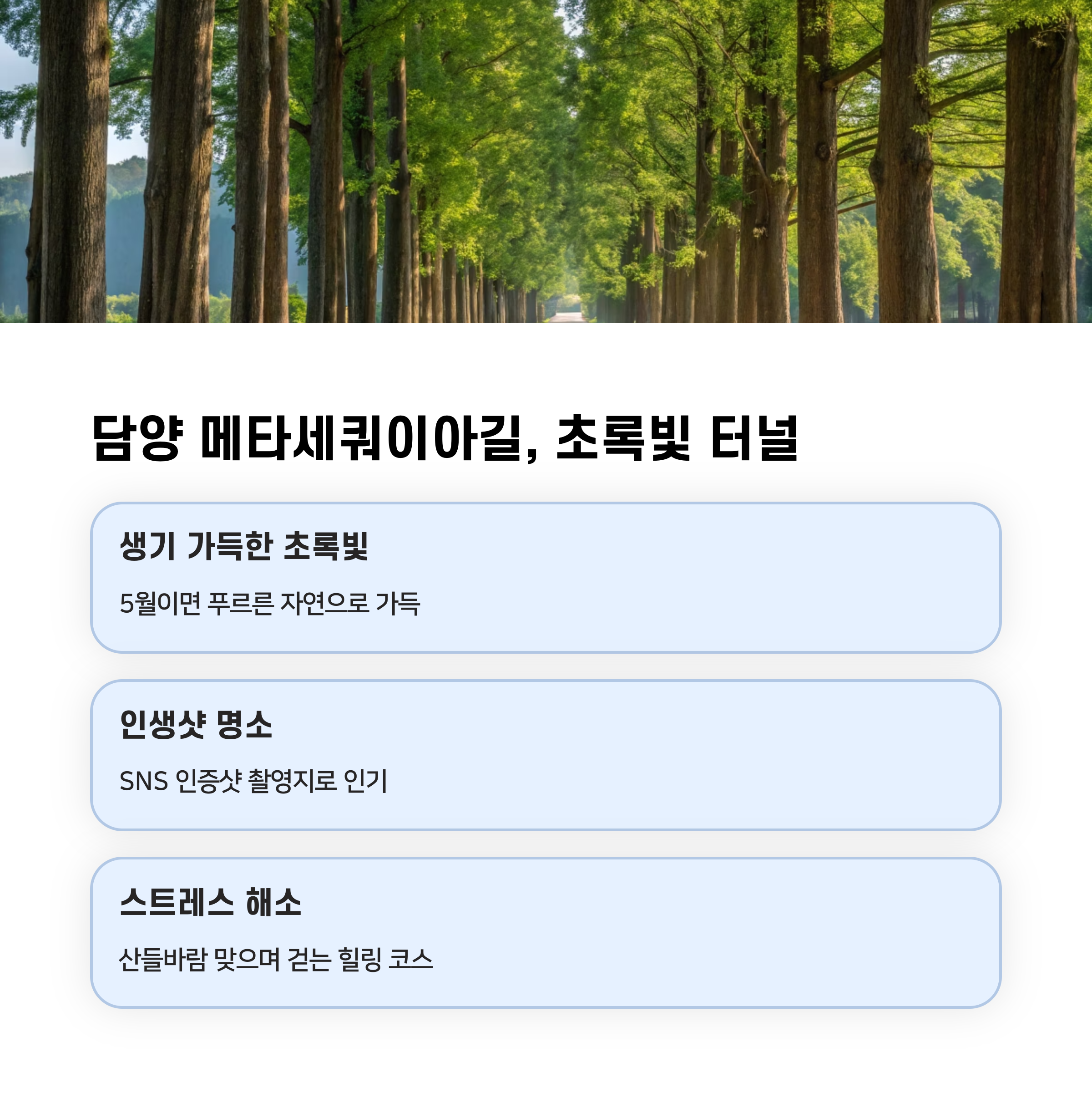 | 담양 | 메타세쿼이아길, 죽녹원 | 산책, 힐링 |