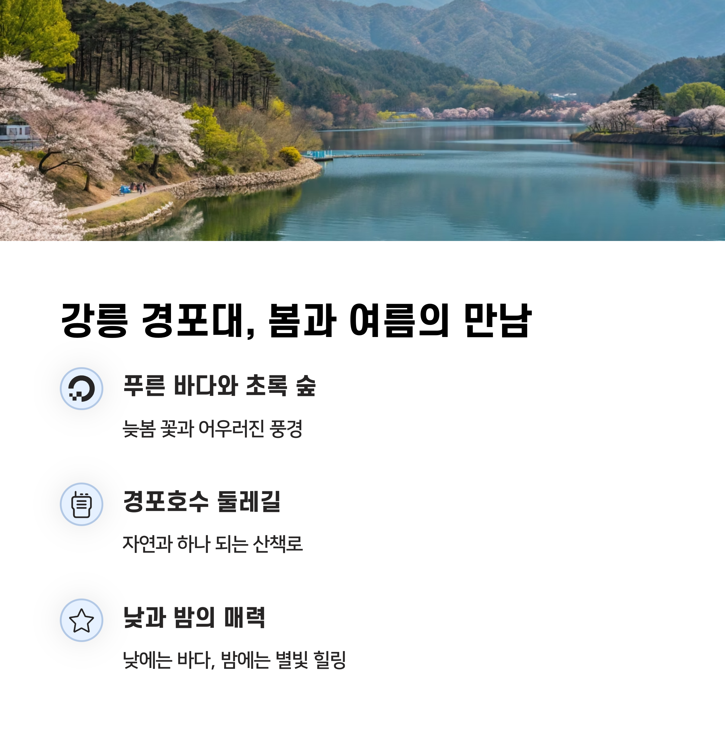 | 경포대 | 경포호수, 해변 산책로 | 해변 걷기, 야경 감상 |
